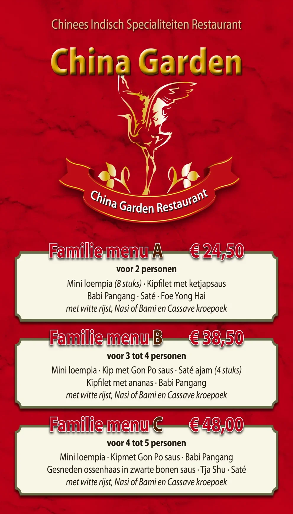 - Mini loempia · Kipfilet, bereid als in het Keizerlijk Paleis (pikant) Babi Pangang · Gesneden ossenhaas in zwarte bonen saus · Tja Shu · Satémet witte rijst, Nasi of Bami en Cassave Kroepoek